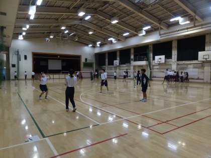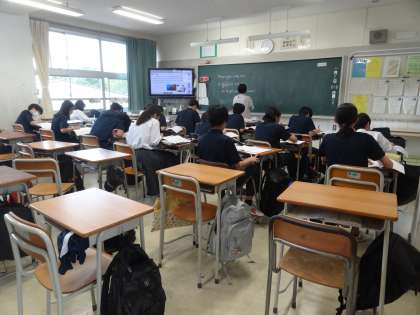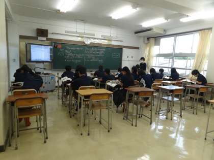 3校時の1年生の授業は、蒸留(理科)、英語(写真付き)、歴史的仮名遣いと現代仮名遣いを区別しよう(国語)です。2年生は、社会、バレーボール(保健体育・写真付き)、合唱(音楽)です。3年生は、変化の割合(数学)、英語です。