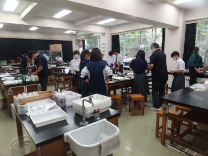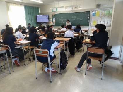 4校時の1年生の授業は、合唱、生姜焼きの作り方(家庭科・写真付き)、質量パーセント濃度(理科)です。2年生は、光合成で二酸化炭素が使われているか確かめよう(理科・写真付き)、英語、バレーボール(保健体育・写真付き)です。