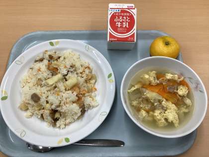 今日の献立は、シーフードピラフ、卵入り野菜スープ、みかん、牛乳です。