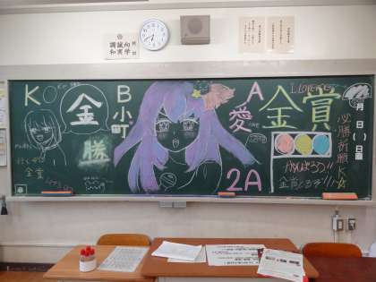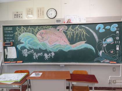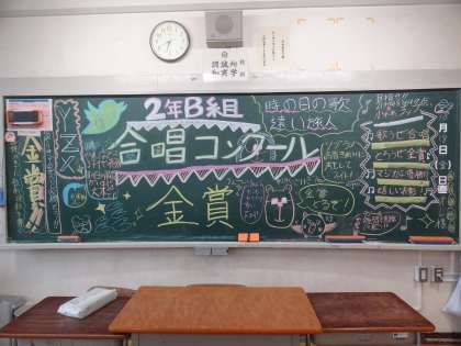 今日は若竹祭。合唱コンクールと舞台発表があります。各クラスの黒板アートを紹介します。2年生の合唱発表は10時15分の予定です。