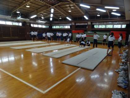 2校時の2年生の授業は、バレーボール(保健体育・写真付き)、グラフの製作(技術)、扇の的(国語・写真付き)です。3年生は、数学、社会、マット運動(保健体育・写真付き)です。
