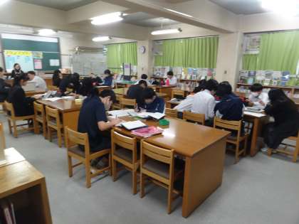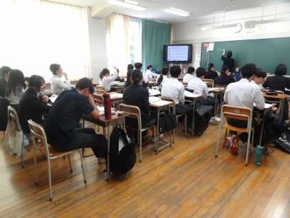 4校時の2年生の授業は、英語(写真付き)、保健体育です。3年生は、国語(写真付き)、バレーボール(保健体育・写真付き)、価格の動き(社会)です。