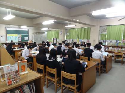 5校時の授業は、労働問題(社会)、美術(写真付き)、図書館(国語・写真付き)です。
