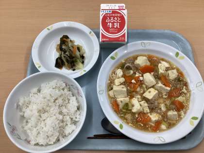 今日の献立は、麦入りごはん、西湖(シーホー)豆腐、わかめサラダ、牛乳です。