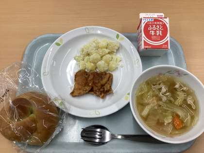 今日の献立は、あしたばパン、鶏肉のマーマレードソース、粉吹き芋、ベーコンと野菜のスープ、牛乳です。