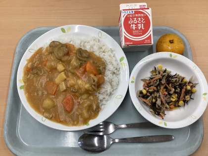 今日の献立は、シーフードカレーライス、ごぼう入りサラダ、みかん、牛乳です。