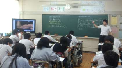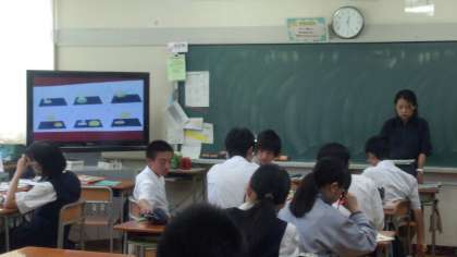 その中で、左の写真は、3年生の英語の授業です。ワークの絵を実物投影機で大きく拡大して、先生と生徒との英語でのやりとりが進められていました。お好み焼きの作り方が題材だったでしょうか。右の写真は、2年生の理科です。こちらはNHKの教材から、筋肉の運動についての映像を使った授業です。特に理科や社会は「百聞は一見にしかず」の効果があります。理科は毎回実験するわけにはいかないし、社会は見学に行くのには無理がありますから、ICTを効果的に使うのは大きな意味がありますね。先生が説明するだけでなく、映像を見ればもっとよくわかるのです。