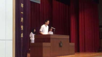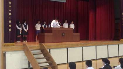 1学期最後の生徒朝会がありました。各専門委員長から、生徒の皆さんに反省とお願いが発表されました。視聴覚委員会からはお昼の放送のリクエストについて、生活委員会からは給食アンケートについて、体育委員会からはボールの貸し出しについて、図書委員会からは図書室の利用について、保健委員会からは食中毒の防止について、具体的な話がありましたが、集中して話を聞くことができていました。