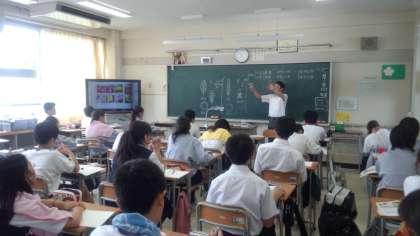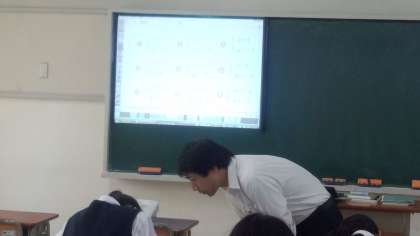 右の写真は、2年生の数学、少人数の授業です。デジタル教科書の問題をスクリーンに映して、繰り返しの学習をしています。少人数なので、個別指導も充実しています。