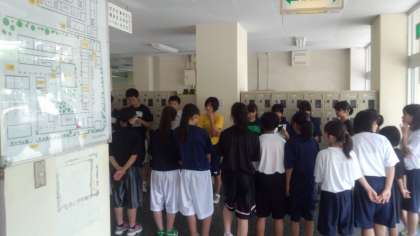 写真は男子・女子バスケットボール部の練習後、玄関でミーティングをしているところです。先輩たちの「心」を受け継ぎ、夏休みの練習に汗を流しています。