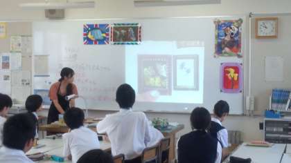 左の写真は3年生の美術です。こちらもICTの活用と本時の目標を提示しています。たいへんわかりやすく、生徒たちも楽しそうに授業に臨んでいました。
