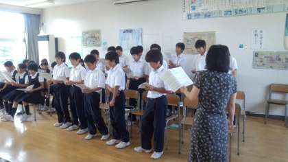 中央は1年生の音楽です。合唱コンクールの練習が始まっています。CDを効果的に使い、生徒たちは表情豊かに歌っていました。