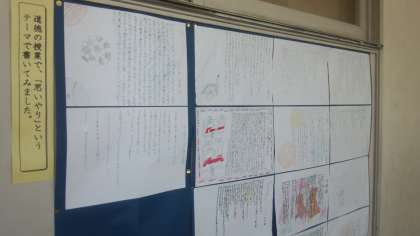 写真中央は2年生です。道徳の時間に「思いやり」についての考えや体験などを一人ひとりが書いたものが掲示されています。全部読んでみましたが、身近な思いやり、地球規模の思いやり、思いやりを受けた体験などを、文章や詩で表現していました。すばらしいです。