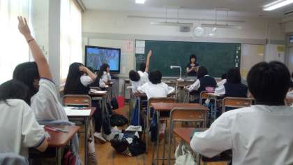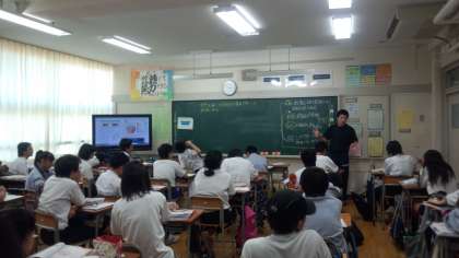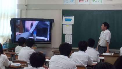 中央は、2年生の理科(第1分野)「実験のまとめ」です。先生が実験をビデオに録画しておき、確認のために見せたり、他の実験の様子を見せたりしているので、生徒にとってわかりやすく、集中して学習できていました。