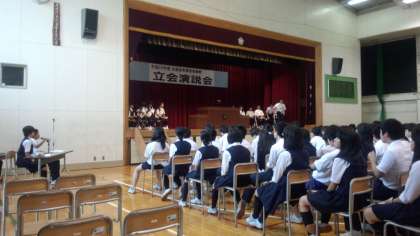 今日の6時間目に立ち会い演説会がありました。立候補者の演説はどれも立派でしたが、私が「将来、駒沢中の校長になってほしい」と思うぐらいのすばらしい演説をした生徒も数名いました。応援者も立候補者を心から応援している姿がよかったです。