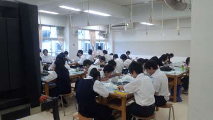 左の写真は2年生の家庭科です。被服室で、マスコットを作っているところです。男子も女子もみんな楽しそうに作業をしていました。週に1時間しかない家庭科の授業も生徒たちは大切にしてくれています。