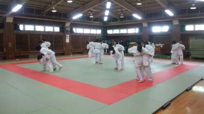 右の写真は、1年生女子の保健体育(柔道)の様子です。まず受け身を繰り返し練習します。受け身は柔道の技術としてだけでなく、後頭部の強打を防いだり衝撃を和らげたり、日常の中でとっさの時に安全に自分の身を守るためにとても有効なスキルだと思います。先生は受け身の指導を欠かさず、時間をかけてていねいに行っています。背負い投げの練習の様子が写っていますが、実際には投げていません。投げる前までの動作をゆっくりと繰り返し指導しています。