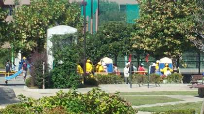 さて、あと2枚の写真は、午前中、小泉公園で行われた上馬・駒沢明和会の防災訓練の様子です。仮設トイレの設置とスタンド式放水器の操作の訓練でした。私も消防署の方に使い方を説明していただきました。
