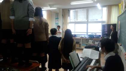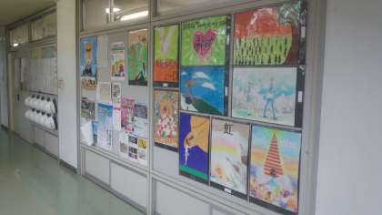 写真は3年生のクラスでの練習風景と、職員室前のポスターです。