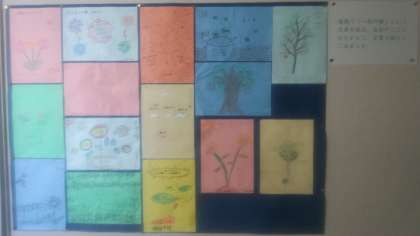 左の写真は、2年生の廊下の掲示物です。道徳の時間に「一粒の種」という資料を使って授業を行いましたが、その時の考えや思いを自分のことに置き換えて、ことばと絵で表現した掲示です。みんなとてもよく考えていて、すばらしいと思いました。心が育ってきましたね。