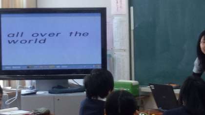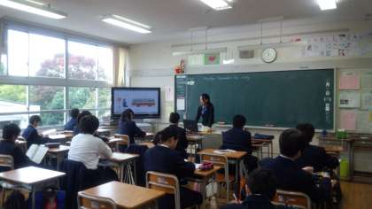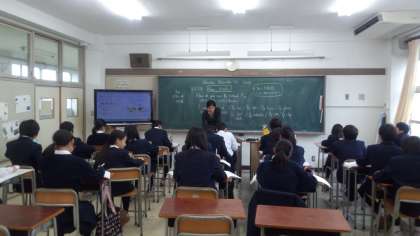 写真は3時間目の1年生の英語です。2クラスを3つに分けて、3教室で授業をしている様子です。どのクラスも大型テレビを使い、わかりやすい授業を心がけています。