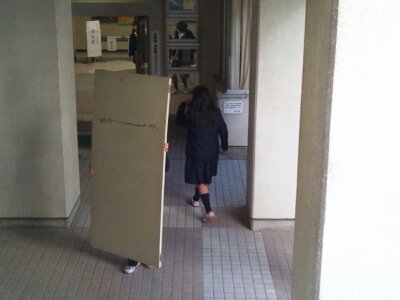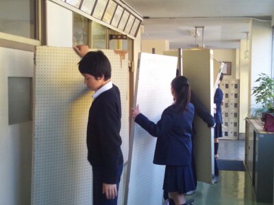 写真は作品展で使用したパネルを片づけているところです。