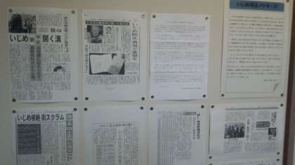 右の写真は、1階東廊下の「いじめ関連」のコーナーです。いじめに関する新聞記事がスクラップされています。「いじめは絶対にしない、許さない」「自分の命も他の人の命も大切にする」と、あらためて心を強くもってください。