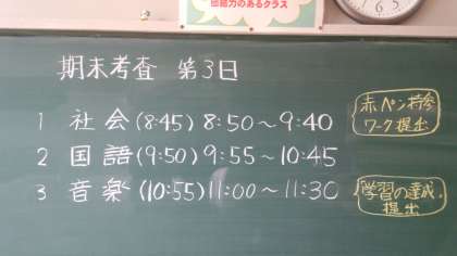 期末考査もあと一日になりました。生徒が下校した教室を見回っていると、明日の考査の時間割が黒板に書いてありました。今日の放課後、しっかりと準備をしてくださいね。
