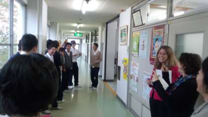 お二人の先生を待っていたのは、3年生の男子によるウェルカムセレモニーでした。私もまったく知らなかったのですが、アメリカからのお客様が来ると聞き、自分たちで考えたようです。サプライズでしたが、たいへん喜んでくれました。3年生、ありがとうございました。