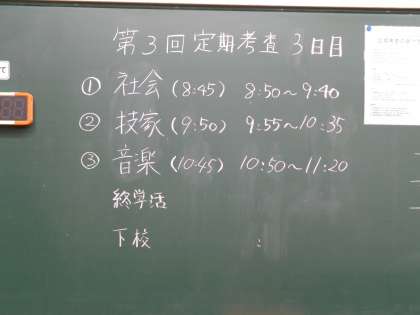 おはようございます。今日は定期考査最終日です。今日の科目は、社会(50分)、技術・家庭(40分)、音楽(30分)です。今日も給食の提供はありません。下校時刻は11時40分です。再登校は14時です。雨が降っていますので気を付けて登校してください。