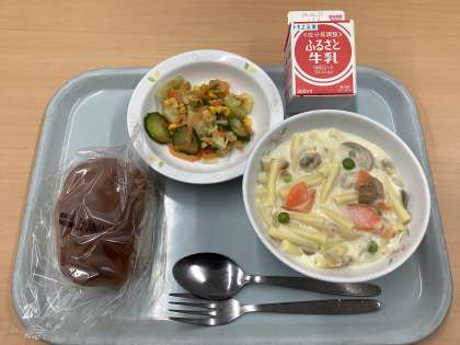 今日の献立は、バターロールパン、マカロニのクリーム煮、ポテト入りフレンチサラダ、牛乳です。