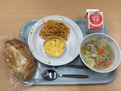 今日の献立は、ソフトフランスパン、チーズ入りオムレツ、スパゲッティソテー、野菜スープ、牛乳です。
