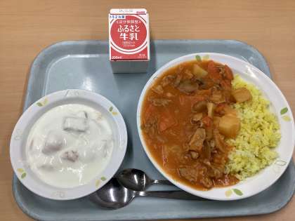 今日の献立は、ハッシュドライス、フルーツのヨーグルトがけ、牛乳です。
