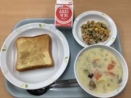 今日の献立は、セサミトースト、さつまいものシチュー、ビーンズサラダ、牛乳です。
