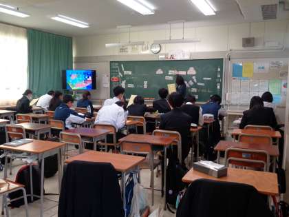 3校時の2年生の授業は、リコーダー(音楽)、東京の課題と解決策について考えよう(社会)、比較級(英語・写真付き)です。3年生は、調理実習(家庭科)、数学です。