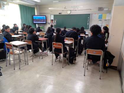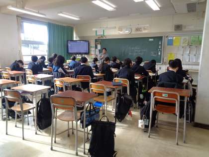 1校時の1年生の授業は、ダンス(保健体育)、英語(写真付き)、社会(写真付き)です。2年生は、書写、国語、東北地方の産業の特色を理解しよう(社会)です。3年生は、数学、ダンス(保健体育・写真付き)、理科です。