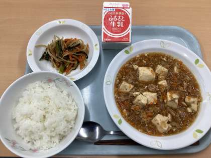 今日の献立は、ごはん、麻婆豆腐、ナムル、牛乳です。