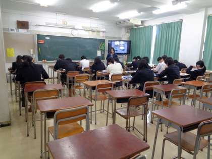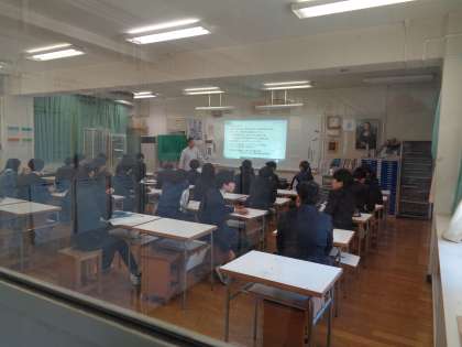 3校時の1年生の授業は、作用点(理科)、社会、書写です。2年生は、数学、理科、伝統文化と人々の生活の関係を理解しよう(社会)です。3年生は、英語(写真付き)、石彫(美術・写真付き)です。
