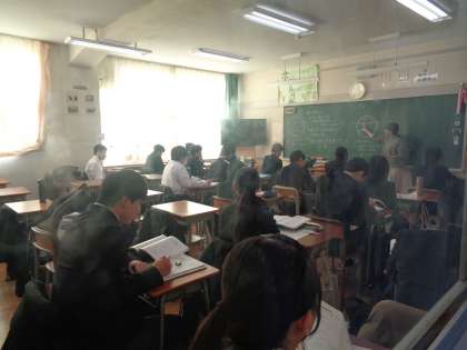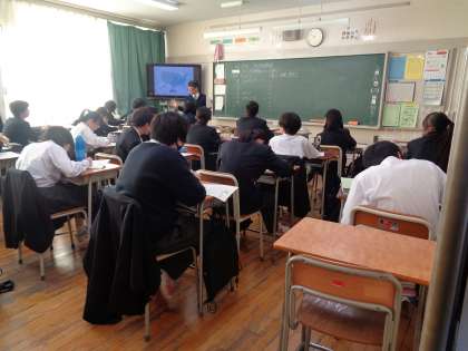 2校時の1年生の授業は、アメリカ合衆国を知ろう(社会・写真付き)、マグマ(理科)、英語です。2年生は、ダンス(保健体育・写真付き)、社会、英語です。3年生はダンス(保健体育)、数学(写真付き)です。