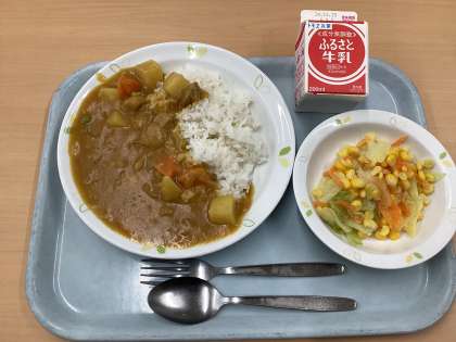 今日の献立は、カレーライス、コーンサラダ、牛乳です。