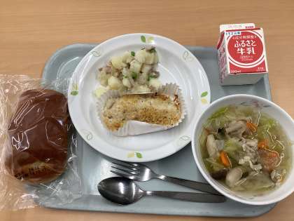 今日の献立は、ダイスチーズパン、魚のチーズハーブパン粉焼き、ジャーマンポテト、しめじ入り野菜スープ、牛乳です。