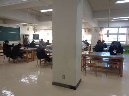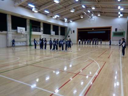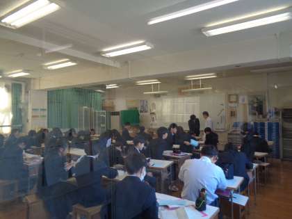 3校時の1年生の授業は、数学、美術(写真付き)、英語です。2年生は、大縄跳び(保健体育・写真付き)、血液の種類と血管について(理科)、助詞(国語)です。3年生は、パート別合唱(音楽)、家庭科(写真付き)、社会です。