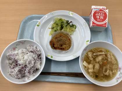 今日から給食提供開始です。今日の献立は、ゆかりごはん、松風焼き、野菜の昆布和え、よしの汁、牛乳です。なお今日の献立内容の変更がありました。松風焼きの鶏ひき肉が食材調達の都合により、豚ひき肉に変更になりました。ご了解の程よろしくお願いします。