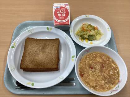 今日の献立は、ツナピザトーストサンド、卵とトマトのスープ、ポテト入りフレンチサラダ、牛乳です。ツナピザトーストサンドは、ツナピザを2枚のパンで挟んでいます。