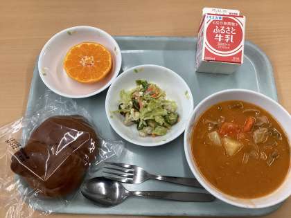 今日の献立は、ココアパン、ハンガリアンシチュー、チーズサラダ、ぽんかん、牛乳です。