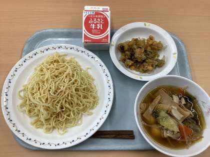 今日の献立は、つけしょうゆラーメン、大豆とじゃこの甘辛揚げ、牛乳です。