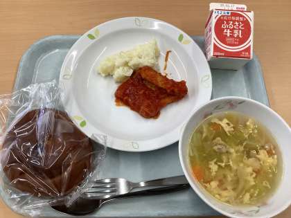 今日の献立は、黒砂糖パン、いかのチリソースかけ、マッシュポテト、卵入り野菜スープ、牛乳です。