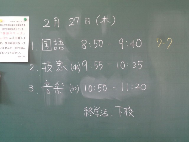 定期考査の中日の教科は国語(50分)、技術・家庭(40分)、音楽(30分)です。下校時刻は11時40分の予定です。今日も給食の提供はありません。最後まで見直しをしましょう。