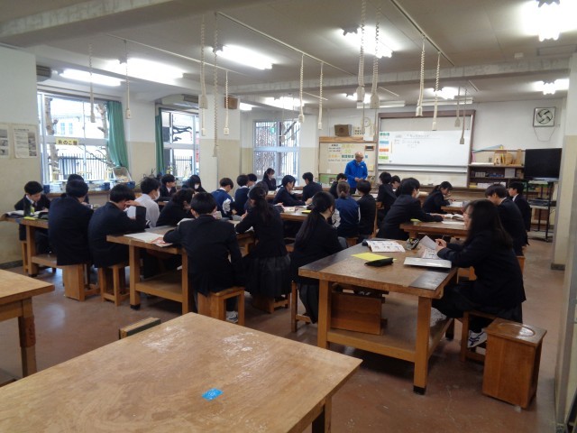 5校時の1年生の授業は美術(写真付き)、漢字の成り立ち(国語)、欲求の種類(保健体育)です。2年生は、日本の領土・国境が「確定」するまでの過程を理解する(社会)、理科、情報の技術の工夫(技術・写真付き)です。3年生は数学、理科、英語です。