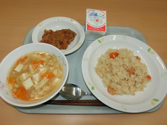 今日の献立は、チャーハン、鶏肉のねぎソースかけ、麻婆スープ、牛乳です。